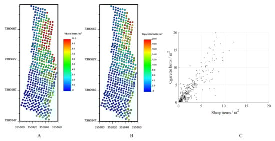 Location maps of sampling data: (A) cigarette butts, (B) sharp items. (C) Scatter plot between cigarette butts and sharp items.