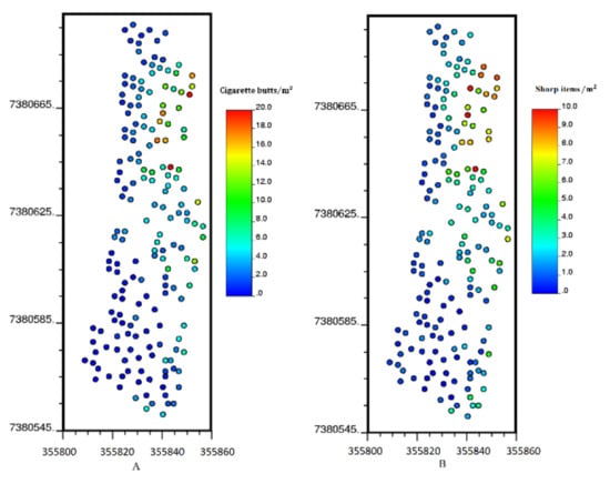 Overall, cigarette butts and sharp items were gathered at 530 sampling locations in the study area (Figure 5). Table 1 shows the main statistics of the collected data. As noted above, there is a high correlation between the two variables, which allowed us to model the two variables jointly.