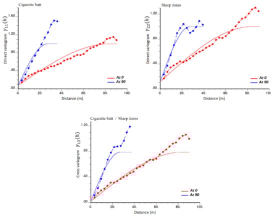The sill matrices associated with the nugget and spherical structures are positive semidefinite, which ensures that the model is mathematically consistent []. In Equation (3), index “1” refers to cigarette butts and index “2” to sharp items.