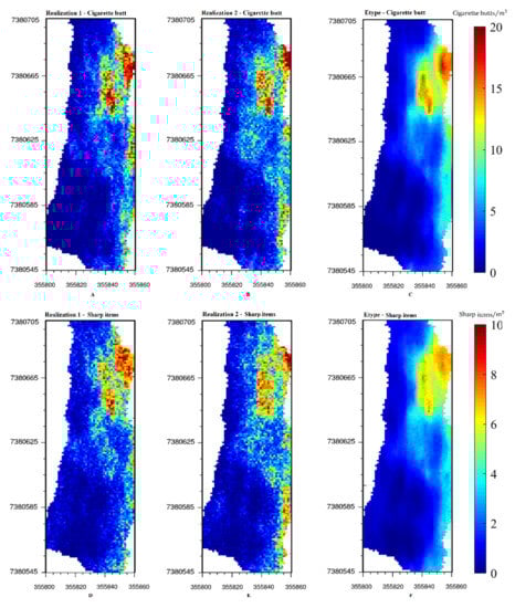 The two variables were simulated jointly and 100 conditional realizations were generated with the turning-bands algorithm. Figure 8 shows the first two realizations and the average of one hundred realizations for each variable. As can be seen from Figure 8C,F, there is a high concentration of sharp items and cigarette butts in the northeastern part of the study area, which is the most contaminated. Generally, it can be observed that there is less beach litter in the western part, that is, closer to the ocean, which could be because visitors tend not to sit so close to the ocean.