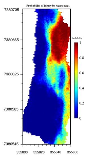 Map of the probability of injury by sharp items calculated on the basis of hundred generated realizations.