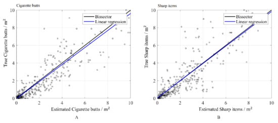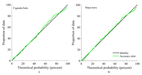 As observed in Figure 11, the results of this process suggest that the proposed approach is accurate for both cigarette butts and sharp items, insofar as the regression of the true values upon the estimated values (average of 100 realizations) is close to the identity. The results can also be validated with a graph termed an accuracy plot []. The realizations are used to obtain a local distribution of the variables at each location of the testing subset. Then, an interval can be constructed considering a given probability . This process is repeated many times for different probabilities. One then draws the theoretical probability versus the observed proportion of data for which the true value falls into the probability interval. The results of the simulation are accurate if the points are close to the diagonal, as is the case here for both variables (Figure 12).