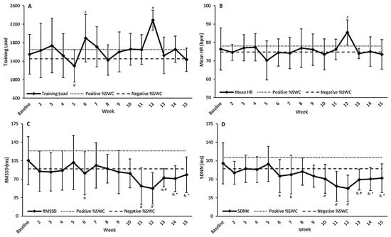 Changes from baseline over the 15-week monitoring period for (A) training load, (B) mean heart rate, (C) root mean square of successive RR interval differences (RMSSD), and (D) the standard deviation of all normal to normal RR intervals (SDNN). Data are presented as means ± SD, with dashed lines representing the positive and negative percentage smallest worthwhile change (%SWC, 3%) from baseline [31]. a indicates possibly lower compared to baseline. b indicates likely lower compared to baseline. c indicates likely higher compared to baseline. d indicates very likely lower compared to baseline. e indicates very likely higher compared to baseline. * indicates likely higher compared to week 12. # indicates very likely higher compared to week 12.