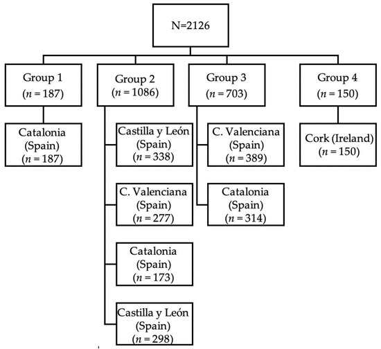 The total sample analysed was made up of 2126 cases. In terms of the regional distribution, Cork (Ireland) collected data on 7.1% (150) of the cases, 44.7% (951) were in Catalonia, 48.2% (1025) in the regions of Valencia and Castilla y León (Spain). Regarding the obstetric unit size distribution, S1 represented 8.8% (187) of the cases, 51% (1086) were in S2, 33% (703) were in S3 and 7.1% (150) were in S4 (Figure 1).