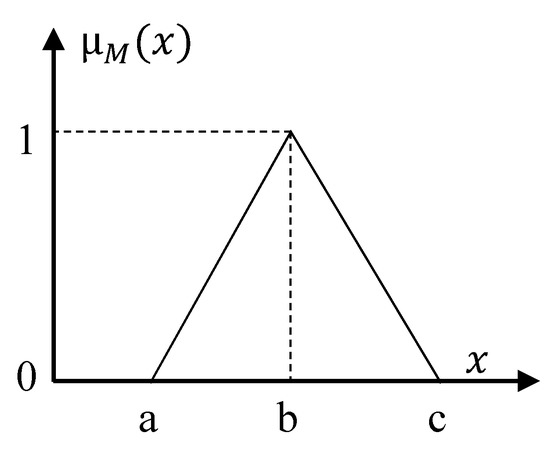 where represent the lower, median, and upper bounds of fuzzy sets, which are user parameters. Each linguistic variable of each input corresponds to a fuzzy set and has a triangular membership function with different parameters (i.e., , , ). Figure 3 shows the triangular membership function graph.