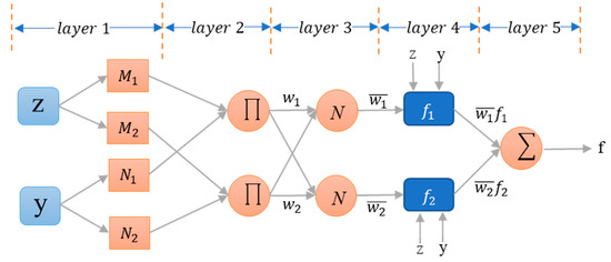 Jiang et al. [25] combined FIS with neural networks in 1993 in order to overcome the shortcomings of FIS and introduced Adaptive Neuro-Fuzzy Inference System (ANFIS). ANFIS is essentially a neural network with five layers. If there are two inputs parameters, z and y, and accordingly one output f, then the constructed rules can be shown as Equations (3) and (4).