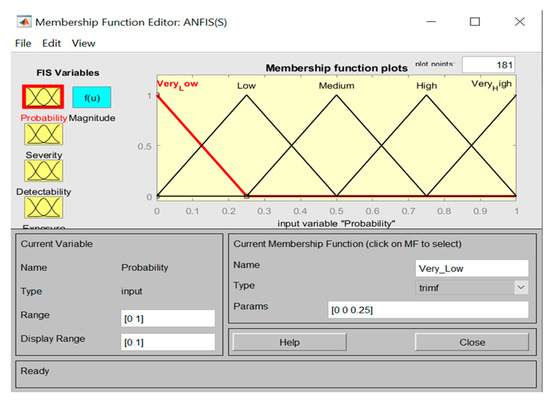 Step 2. Construct Fuzzy sets: ANFIS is a fuzzy inference system, in which membership functions and fuzzy sets should be defined in the preparation process of ANFIS, as adopted in this paper to identify fuzzy sets for output variable (Risk Magnitude). Notably, as mentioned by Ponce et al. [61] and Chang et al. [62], the most proper type of fuzzy interface system for adaptive approaches is Takagi-Sugeno Fuzzy Model. Because the triangular membership function is one of the simplest among the other types and can be easily applied to the parameters, Triangular Membership Function is used in this paper, as in Equation (5).