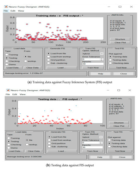 Step 6. Verify the accuracy of the Model: To further verify the accuracy of prediction of ANFIS, some performance indices like RMSE (root-mean-square error) and MAPE (mean absolute percentage error) are used. Using these performance indices, it can be assessed if the prediction made by ANFIS is consistent with the real output or otherwise [63]. These three performance indices are presented as in Equations (11)–(13):