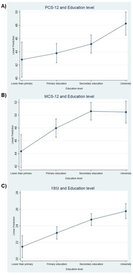 Relationship between Educational level and PCS-12 (A), MCS-12 (B) and FBSI (C).