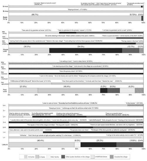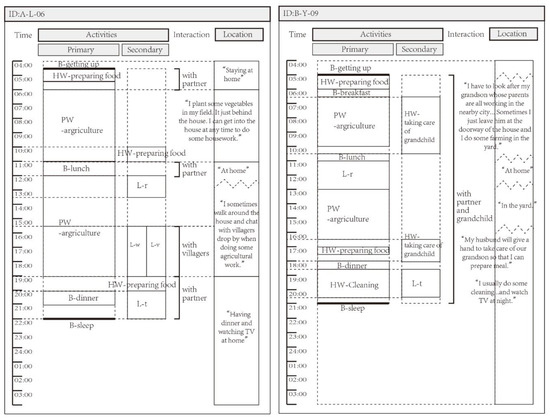 - Prepared forms for recoding daily activities of the “typical day”. The systematic recording of an individual’s activities, including the sequence, time point, duration, etc. in a specific short period of time (such as a 24-h cycle) is called the time budget or patterns of daily occupations [76]. The time–space budget was developed on the basis of the time budget, which contains the spatial information related to the location of activities [77,78]. Data for this research was mainly collected through an open-ended or pre-arranged activity diary, and participants were required to report what they were doing over a certain period of time. The extended activity diary also recorded data on locations, relationships, and other expectations of daily occupations [79]. Using the method of a recall diary, i.e., we asked the respondents to recall the activities on their “typical day” and reconfirm whether they think the recorded date was “the most common” to exclude the “special” date from the analysis [44]. Although post-event recall may be biased due to memory limitations of older adults, the false reconstruction [80] can instead be considered as an “aggregation” of longer-term daily experience. This method is helpful to acquire more reliable, non-interference, and as many sample data as possible. In terms of coding for activities, the classic time allocation model divided activities into two categories: work and non-work [63], and there were also occupations engaged in maintenance, work, rest, or leisure [44,81]. According to the pre-survey, we coded the activities as below: basic living (B), paid work (PW), housework (HW), and leisure activities (L). Leisure activities include watching TV (L-t), card games (L-c), dancing and music (L-m), taking a walk (L-w), taking a rest (L-r), cultural activities (L-a; reading, radio, internet, etc.), and chatting (L-v). The main activity and secondary activity, as well as descriptions of the activities, were also recorded (Figure 1).