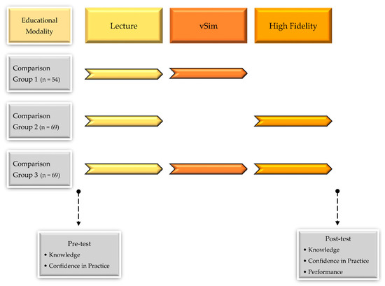 This is a pre- and post-quasi-experimental study with three comparison groups. Three educational modalities were applied after a lecture: virtual reality simulation (vSim) for comparison group 1 (Com 1), HFS for comparison group 2 (Com 2), and a combination of learning methods (vSim with HFS) for comparison group 3 (Com 3) (Figure 1).