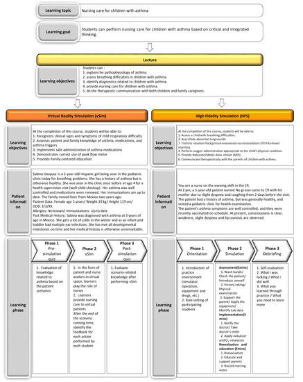 In this study, three educational modalities (lecture, vSim, HFS) were applied on the participants who were caring for children with asthma. The goal of this education was to improve nursing students’ caring competency and the critical and integrated thinking for children with asthma. Based on the learning objectives established by the Korean Academy of Child Health Nursing [16] and the clinical nursing protocol [17,18,19,20] for children with asthma, the learning objectives connected to goals were set based on each of the three educational modalities. The learning objectives of the three educational modalities (lecture, vSim, and HFS) are linked. Based on the learning objectives of “lecture,” learning objectives of both vSim and HFS were reconfigured according to the strength of both vSim and HFS for more effective practice (Figure 2).