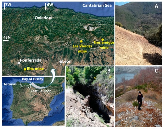 Location of main cities and mines cited in the text. (A) Spoil heap at Rita mine (Compludo, León); (B) Tres Amigos mine (Polentinos, Palencia); (C) spoil heap at Las Viescas mine (Riaño, León).