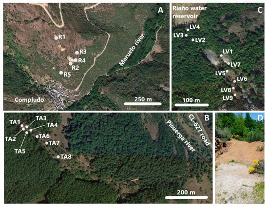 Location of sampling points. (A) Rita mine (samples R1 to R5); (B) Tres Amigos mine (samples TA1 to TA8); (C) Las Viescas mine (samples LV1 to LV9); (D) location of sampling point TA1 in a spoil heap at Tres Amigos mine (pointed by the hammer).