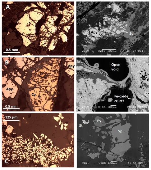 Mine wastes microtexture. Each line combines pairs of images captured by optical microscopy (left column) with SEM backscattered-electron images (right column). (A) Rita mine: Individual arsenopyrite crystals (left image) and scorodite (Sc) neoformation (from arsenopyrite (Apy) weathering (right image). (B) Tres Amigos mine: Primary arsenopyrite (Apy) and chalcopyrite (Cp, left), and iron oxide crusts partially filling open spaces (right). (C) Las Viescas mine: Idiomorphic arsenopyrite crystals in a calcite gangue (left) and disperse sphalerite (Sp)-pyrite (Py)-stibnite (St) (right).