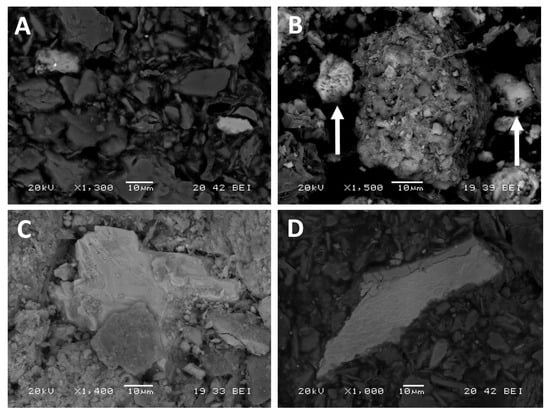 Firstly, the predominance of the residual phase that was previously indicated is evident in the observation of the soil samples with SEM using backscattered electrons: As-rich particles are very frequent; they are variable in size, almost always angular and generally homogeneous, constituted by sulfides, oxides and intermediate phases of As-Fe (Figure 4A).