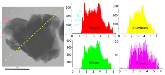 HR-TEM image of a clayey particle in sample R2. The yellow line indicated the section of the analysis. Graphs on the right show the distribution of O, Al, Si, and As. Note the difference between the vertical scales of the elements’ graphs.