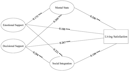 Model 3 added the health variables and revealed that the elderly individuals with better self-rated physical health (β = 0.073, p = 0.000), mental state (β = 0.246, p = 0.000), and social integration (β = 0.199, p = 0.000) reported higher living satisfaction. In addition, after adding the health variables, the relationship between emotional support and living satisfaction was no longer significant (β = 0.010, p > 0.05). The positive and significant effect of decisional support on living satisfaction did not change, while the regression coefficient (β) decreased from 0.263 to 0.114. The results of model 3 suggest that multidimensional health might have a mediating effect on the relationship between emotional support, decisional support, and living satisfaction.