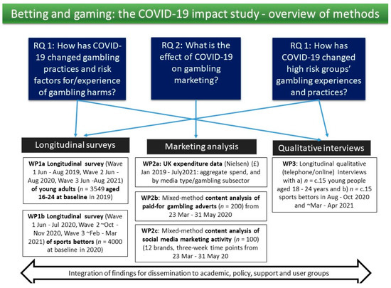 This study aims to address the following three overarching research questions (RQs): (RQ1) How has COVID-19 changed gambling practices and the risk factors for, and experience of, gambling harms? (RQ2) What is the effect of COVID-19 on gambling marketing? (RQ3) How has COVID-19 changed high risk groups’ gambling experiences and practices? We hypothesise that two groups, young adults and sports bettors, may experience particular risk of adopting more risky, online gambling practices during the COVID-19 pandemic and its associated restrictions. Young adults are at high risk of experiencing gambling harms [13], with high incidence rates for problem gambling. They are also a group who may be particularly affected by changes to their ability to socialize (e.g., meeting in licensed premises, meeting outdoors) or their prospects for and conditions of work. Regular sports bettors, immersed in sporting environments where gambling is normalised, are arguably most affected by changes in the gambling landscape following lockdown restrictions put in place to limit the spread of COVID-19 during 2020; and it is anticipated that, as restrictions ease, there will be a proliferation of sports events on which to gamble and likely heightened industry marketing and advertising.