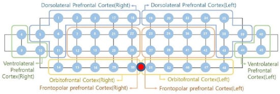 Figure 1, red dot) was matched to the subject’s FPz and the bottom-most part of the device was right above the eyebrows. Based on the Brodmann area (BA), 48 channels were recorded on both sides of the dorsolateral prefrontal cortex (DLPFC, BA 9, 46), ventrolateral prefrontal cortex (VLPFC, BA 44, 45, 47), frontopolar prefrontal cortex (FPC, BA 10), and orbitofrontal cortex (OFC, BA 11).