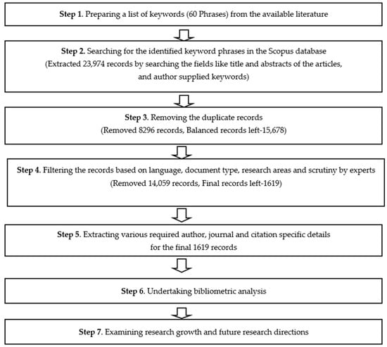 In the next step, the duplicate records were removed, and a total of 15,678 records covering journals, books, and conferences were left. The number of records was further pruned based on language, document type, and research areas. For the purpose, all document types in the English language from the selected research areas (Business, Management, Accounting, Social Science, Economics, Econometrics and Finance, Arts and Humanities, Decision Science, Psychology, Multidisciplinary, and Neuroscience) were considered. Considering the relevance of green products to the domain of Marketing Management, the research areas having direct or indirect linkage with this domain were selected based on expert opinion. The rest of the research areas having very remote or no linkage with the domain of Marketing Management like Physics, Chemistry, Mathematics, Nursing, Fishery, Dentistry, Pharmacy, Agriculture, Crime Prevention, etc. were excluded from the results in consultation with the experts. This resulted in the selection of a total of 1720 records out of 15,678 records. To extract the records, a complex query with required considerations could have also been executed. However, to ensure the inclusion of all relevant publications, various records were first extracted against the keyword phrases relevant to the domain of Marketing Management and then pruned further. Thereafter, the titles, abstracts, and author-supplied keywords of these 1720 records were scrutinized for relevance against the 60 keyword phrases by experts consisting of a group of five academicians. These experts manually examined the abstracts of all the 1720 publications so that any publication not thoroughly covering the green products in the domain of Marketing Management could be excluded from the further analysis. The experts had at least 10 years of research experience in the fields of Marketing Management and/or Sustainability. Finally, a total of 1619 records were left for further analysis.