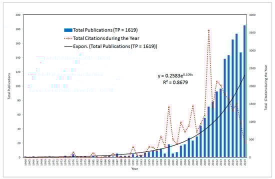 The number of publications is the key to establish the progress of any research field []. However, the citations scored by the article since its publication indicate the global impact of the publication []. The selected 1619 publications on green products accumulated a total of 24,447 citations with an average citation per paper (ACPP) of 15.10 citations. ACPP is calculated as total citations (TC) divided by total publications (TP). In terms of the year with the highest number of citations, it was found that the year 2010 had received the highest number of citations (3557) for the publications produced in this year with an average citation per paper of 50.10 citations. Out of 71 publications in 2010, four publications were highly cited with each having 400 or more citations. The citation data was taken until December 2019.