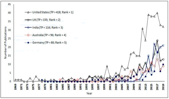 It is found from Figure 3 that authors from the USA were publishing in the area of green products since the year 1969. The first publication from Germany appeared in 1978 and that from the United Kingdom appeared in 1982. Further, the authors from Australia were publishing since 1984. The publications in the area of green products from the Indian authors appeared only in 2003. However, in the last few years, India surpassed Germany and Australia in terms of the number of publications.