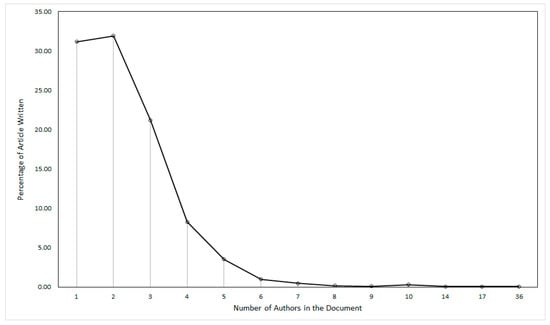 Figure 4 reveals that there was a large dispersion in the authorship pattern. In line with Lotka’s Law [], it is found that not many authors were involved in producing a large number of publications. Most of the publications were authored by either two authors (31.93%) or a single author (31.19%). The domination of small teams of authors and quite a high percentage of single-authored publications as indicated by Figure 4 shows that Lotka’s Law holds in the field of research related to green products. The topmost productive authors in the field of green products are listed in Table 3. It is revealed that M. Charter was the most productive author with the highest number of publications (6), highest h-index (5), and the second rank in total citations (69). M. Charter authored his first article in the area of green products in the year 2008. However, out of the list of the most productive authors, J. Thøgersen started publishing before any other author in the year 2000. J. Thøgersen and N. Pandey jointly followed M. Charter with the second rank when it comes to the number of publications (5). The rest of the authors in the list of the most productive authors produced four publications each. However, J. Thøgersen with 542 citations has the top rank in total citations and is distantly followed by M. Charter (69), P. Castka, (66), A. Lobo and J.J. Zhang (62), U. Tischner (55), and P. Cozens (40), in that order. J. Thøgersen also shared the first rank with M. Charter as far as h-index (5) was concerned. N. Pandey who jointly held the second rank with J. Thøgersen in respect of the total publications started publishing in the year 2018 only and stood at twelfth rank in total citations.