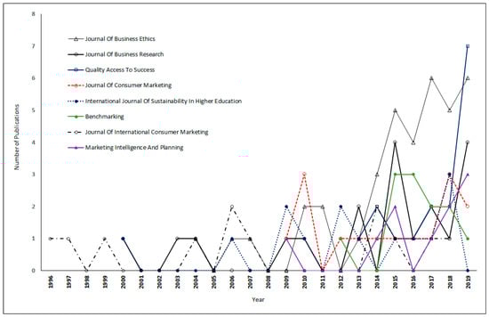 From Table 4, it can be observed that the Journal of Business Ethics with the 2019 journal impact factor (IF2019) of 4.141 was the top-ranked journal in the field of green products, and it published in this area for the first time in the year 2004. It has published 37 articles related to green products with 2441 total citations. Further, it is revealed that the Journal of Business Research (IF2019 = 4.874) was the second most productive journal and it initiated publishing in the field of green products from the year 2000. This journal published 19 articles concerning green products with 975 total citations. In terms of the number of publications, the Journal of Business Research further followed Quality Access to Success (16), Journal of Consumer Marketing (15), and International Journal of Sustainability in Higher Education (14), in that order. Out of the list of the most productive journals, the most recent journal to publish on the green product area was Industrial Marketing Management. This journal started publishing in this area from the year 2017 only and has published 9 articles so far with 65 total citations. On the parameter of impact factor as a measure of journal evaluation [], only four journals out of the most productive list of journals had impact factors in the year 2019. Journal of Business Research had the highest impact factor of 4.874, followed by Industrial Marketing Management (IF2019 = 4.695) and Journal of Business Ethics (IF2019 = 4.141), and International Journal of Sustainability in Higher Education (IF2019 = 2.000), in that order. The rest of the journals in the list of most productive journals were not indexed in the Journal Citation Report.
