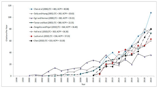 Table 6 reveals that the most cited article with a total of 481 citations was authored by Chen et al. []. It was the most impactful in terms of both early citations (TC0 = 4) as well as the number of citations in the year 2019 (TC2019 = 108). The second most cited article was authored by Daily and Huang (TC = 392) [], followed by articles authored by Egri and Herman (TC = 383) [], Tanner and Kast (TC = 380) [], Dangelico and Pujari (TC = 364) [], Hall et al. (TC = 363) [], Luchs et al. (336) [], and Chen (TC = 333) [], in that order. Further, the articles authored by Tanner and Kast [] and Luchs et al. [] did not score any citations in the year of their publications.