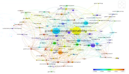 It can be further found from Figure 7 that the available theme areas related to sustainable development were further adopted by researchers working in the field of marketing as shown by the green-colored cluster of keyword terms like marketing, green process innovation, green satisfaction, green brand image, etc. Thereafter, the progression to the green product field saw the application of the knowledge of various available topics by researchers to the theme areas like consumer behavior, green product innovation, green supply chain management, green management systems, etc. that belong to the lemon-colored cluster. The largest node of this lemon-colored cluster is the keyword term sustainability that has a mean value of close to 1.0005 for co-occurrence with the associated keyword terms. Hence, it can be assumed that the authors looked for linkage between marketing and sustainability to venture into the theme of the green products (orange-colored cluster) with related keyword themes like sustainable consumption, green innovation, brand equity, green supply chain, green brand, green advertising, etc. Figure 7 shows that the mean value of the co-occurrence of this green product node with the associated keywords is in the range of 1.005 to 1.010.