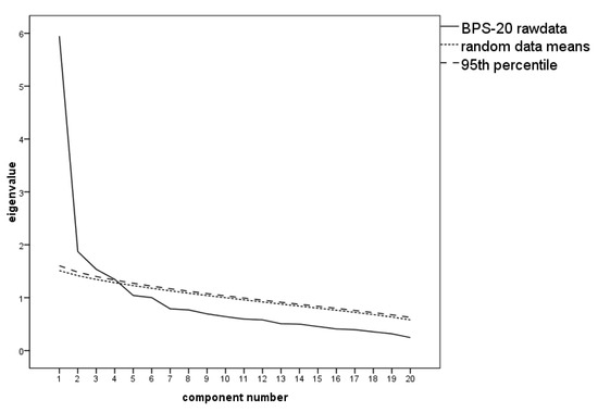 For the 28-item BPS, the initial parallel analysis identified three factors to be extracted. Communalities h2 < 0.30 were observed for thirteen items (2, 3, 5, 6, 7, 9, 17, 18, 22, 23, 24, 27, 28). Five of these items had factor loadings of less than λ = 0.40 (items 3, 6, 7, 22, 27). These items were therefore removed. Items 2, 18, and 28 were subsequently additionally removed for the same reasons. The PA on the reduced 20-item data still suggested three factors to be retrieved (see scree plot in Figure 1). The three-factor solution suggested by the PA explains 46.79% of the variance. An overview of the final EFA can be seen in Table 2.