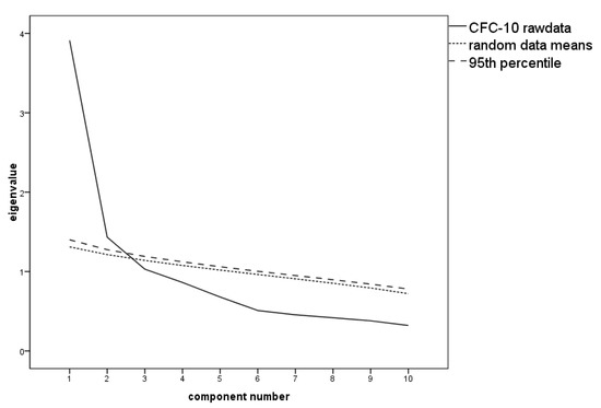 Scree plot with the parallel analysis of the Consideration of Future Consequences Scale (CFC-10) suggesting two factors to be extracted.