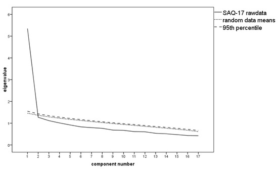 Scree plot with the parallel analysis of the Self-Awareness Questionnaire (SAQ-17) proposing extraction of one factor.