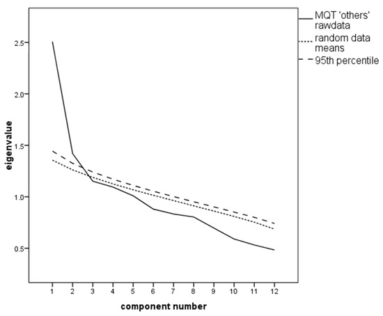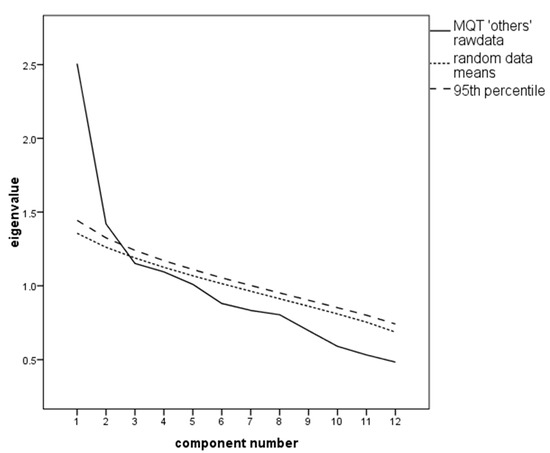 For validation of the questionnaires, the factorial structure was first examined using unweighted least squares (ULS) as the extraction method in the exploratory factor analysis (EFA). ULS does not assume a multivariate normal distribution. Factors are latent dimensions accounting for the greatest possible variance in the original manifest variables (questionnaire items). The factors are integrated into a model designed to be parsimonious. We used the Pearson correlation matrix following the recommendations for EFAs in validation analyses by Izquierdo and coworkers [71]. Prior to the analysis, the suitability of the data for the factorial analysis was checked using the Kaiser–Meyer–Olkin measure (KMO) and Bartlett’s test for sphericity to probe for acceptably large correlations [72]. A parallel analysis (PA) was conducted to determine the number of factors to be retained [73,74]. The PA is considered an accurate tool to detect significant components and to identify the corresponding item loadings, whereas the eigenvalue > 1 criterion has been shown to lead to an over-extraction of factors [75,76]. Therefore, in the PA, the eigenvalues from the raw data of the questionnaires were compared to 5000 simulated random datasets of non-correlated, normally distributed variables. These random data coincide with the raw data in that they comprise an equal number of variables and the same sample size. Significant factors in the PA explain more variance in the actual data than 95% of the random datasets [77]. Items were removed from the German versions of the questionnaire when their communality was below h2 < 0.30 and the factor loadings were smaller than λ = 0.40 on all factors [78]. That is, when both exclusion criteria were met, items were removed. Oblique rotation (direct oblimin) with Kaiser normalization was conducted because this rotation method does not restrict factors to be uncorrelated, but results in a factor solution similar to an orthogonal one [79]. Items with factor loadings of λ ≥ 0.40 were then allocated to the respective factor. For factor loadings λ ≥ 0.40 on multiple factors (cross-loadings), we thoroughly examined the content of the respective items and subsumed them either under both subscales (where the content reflected an interaction of both and was therefore interpretable) or to one of the subscales when the item’s content indicated this unique allocation.