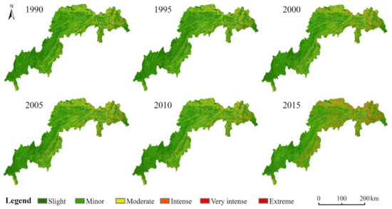 Figure 3 shows the spatial pattern of soil erosion grades between 1990 and 2015. Figure 4 shows the spatial pattern of the average soil erosion degree, which is obtained by averaging the above six stages of soil erosion degree.