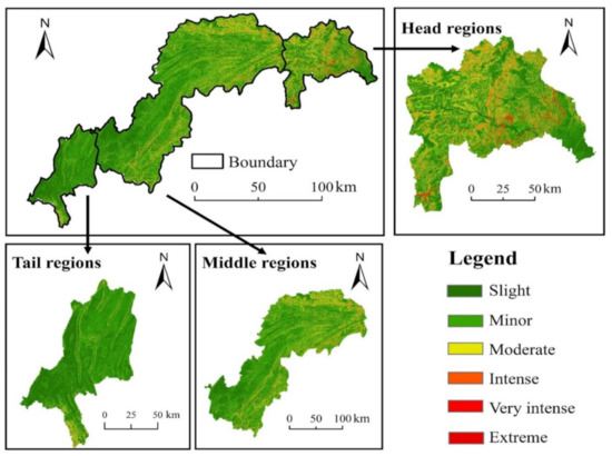 Spatial pattern of average soil erosion degree in the TGRA between 1990 and 2015.