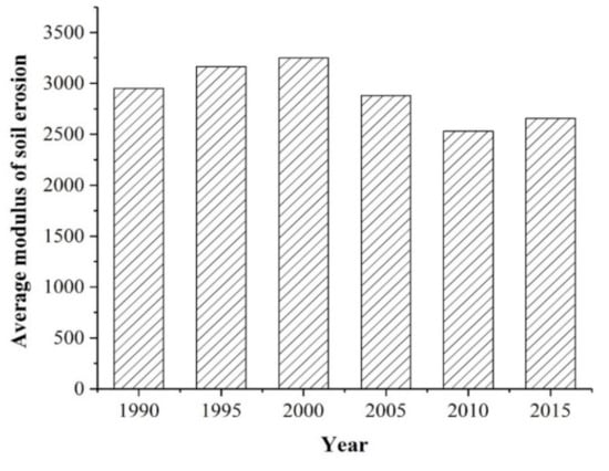 The soil erosion process responds significantly to different land-use types. Table 6 exhibits the statistical information of the soil erosion modulus under different land-use types during six periods. Based on the corresponding soil erosion modulus, we sorted the land-use types. The descending order was as follows: bare land, dry land, paddy field, woodland, grassland, and construction land. The average annual soil erosion modulus of bare land achieved the largest value of 4022.42 tkm−2a−1 in 2000. Chronologically, similar trends were detected for the soil erosion modulus under various land-use types, most of which represented an uptrend from 1990 to 2000, a downtrend from 2000 to 2010, and an increasing trend from 2010 to 2015. This result is consistent with the overall variation trend of the soil erosion modulus in the TGRA.
