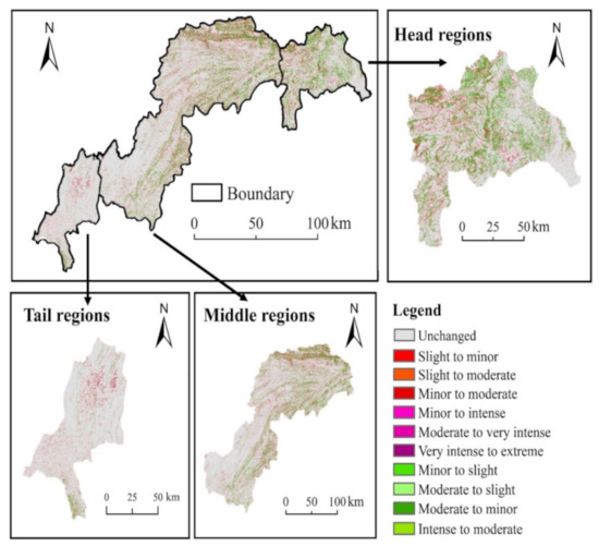 The soil erosion areas that shifted from slight to minor levels were mainly distributed in areas with lower elevations, such as Yichang City, the areas surrounding downtown Chongqing, and areas along the Yangtze River, where the land-use types shifted from grassland to dry land and bare land. The soil erosion areas that shifted from moderate to minor levels were largely situated in Wuxi County, Xingshan County, and Zigui County, where the land-use types shifted from dry land to woodland.