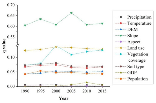 Figure 7 shows the values calculated for different influencing factors on soil erosion within the 25-year period. The results from the factor detector module showed that the explanatory power of influencing factors varied greatly (Table 3), and the values from highest to lowest were slope (), land use (), vegetation coverage (), soil type (), temperature (), precipitation (), DEM (), population (), GDP (), and aspect (). Slope, land use, and vegetation coverage were the three dominant determinants over the 25-year period, and they differed significantly from the other factors, with average values of 0.62, 0.13, and 0.11, respectively. Slope had the strongest explanatory power among the influencing factors. Soil erosion was less affected by population, GDP and aspect, and each had an explanatory power that was less than 0.1.