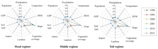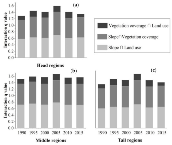Figure 10 shows the discrepancies in the values of the three most dominant interaction factors in the different regions. As the most controlling factor in all regions of the TGRA, the interaction between land use and slope in the head regions of the TGRA, however, was slightly lower than that between slope and vegetation coverage, with a value of 58.3% in 1990. In the middle region of the TGRA, the explanatory powers of the three interaction factors were similar to those in the whole region of the TGRA. Over the past 20 years, the interaction between land use and slope had a stronger effect than that between slope and vegetation coverage, obtaining the greatest explanatory power of 76.7% in 2005. In the tail region of the TGRA, the values of interaction factors were arranged in descending order as follows: interaction between slope and land use, interaction between slope and vegetation coverage, and interaction between vegetation coverage and land use. In 2005, the interaction between slope and land use had the highest explanatory power, with a value of 0.83.