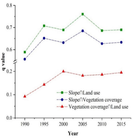 The results from the interaction detector module indicated that the interaction influence of any two factors was greater than that of a single factor to a large extent. The explanatory power of a single factor was obviously lower than that of interactions between factors. Table 4 shows the values of three controlling interactions from 1990 to 2015. These interactions include the enhancements caused by land use and slope, vegetation coverage and slope, and land use and vegetation coverage. Moreover, the interaction value remained relatively stable over the past 25 years.