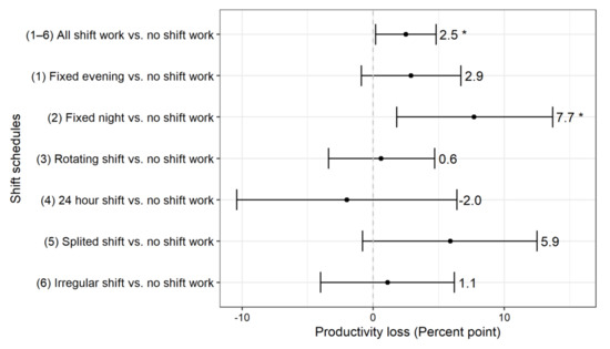 Adjusted differences in work productivity impairment according to shift work schedules; * p-value < 0.05.