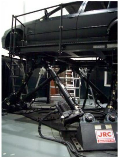 A driving simulator with six degrees of freedom (see Figure 1) was used in the experiment. A passenger car was mounted on the motion base, and five large projections surrounded the car. The driving simulator provided a realistic driving experience to the drivers. To accelerate the development of the driver’s fatigue symptoms, a simulated, straight highway-driving scenario was selected, and there were no other cars in the simulation other than the virtual experimental car during the driving period.