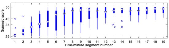 Since the number of segments with a score of 3 was low, the scores of 3 were rescored as 2. In accordance with the length of the ECG signal recommended for short-term HRV analyses [23], the 60-min videos and the ECG signals were divided into 19 five-minute segments, with 40% overlap at each end with the start/end of the adjoining five-minute segments. In each five-minute segment, the scores of every one-minute segment assessed by each expert were summed over. The minimum and maximum of the summed score in a five-minute segment were 25 and 50, respectively. If the summed score is greater than or equal to 38, according to the simple majority principle, the driver can be considered to be in a fatigued state during the five-minute segment, and if the summed score is less than or equal to 37, the driver can be considered to be in an alert state during the five-minute segment. To reduce misjudgments, we adopted the principle of the effective majority, which stipulated that if the summed score was greater than or equal to 40, then the five-minute segment was defined as a fatigued segment; if the score was less than or equal to 35, then the five-minute segment was defined as an alert segment. Otherwise, the segment was defined as a discordant segment. In this manner, we obtained 88 alert segments and 223 fatigue segments for the following analyses. We also obtained 31 discordant segments, which were excluded from further analysis. Figure 2 compares the summed scores of all subjects in 19 five-minute segments. The figure shows that as time elapsed, all subjects essentially changed from an alert state to a fatigued state.