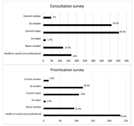 Overall, 765 participants (597 (78%) consumers/public, 168 (22%) HCPHPs) submitted 1887 uncertainties at the consultation stage. These could be anything they deemed important, including safety, effectiveness, different populations, supply or accessibility of e-cigarettes, environmental issues and related products such as snus and heated tobacco. Submitted questions per person ranged from one to 16. Participants ranged in age from 17 to 88 years old (mean age 47 years). Just over half of the participants were male (57.1%). Participants indicated their smoking status (see Figure 1) and could tick all that applied (e.g., current smoker/ex-smoker and current vaper).