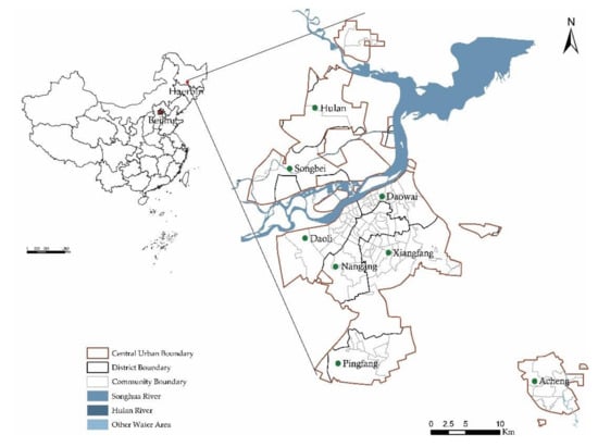 Location of Harbin in China and distribution of the eight districts.