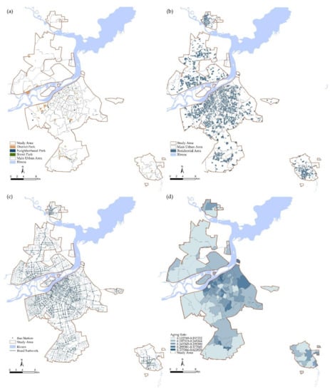 (a)Distribution of urban parks in study area. (b) Distribution of residential area in study area. (c) Information on the road network in the study area. (d) Population density of elderly residents (residents aged 60 and over) at street-level.