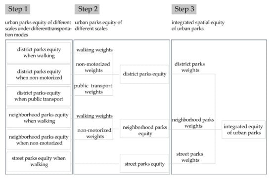 The spatial multi-criteria were used to measure the balance between demand and the supply provided by facilities of different scales, which are applicable to specific groups. It is a common measurement of spatial equity and it is helpful in assessing the effectiveness of existing urban services and providing recommendations on how to allocate public facilities. Here, the spatial multi-criteria analysis was used to assign weights to different levels of urban parks and different modes of transportation to obtain the aggregated equity for each type of urban parks and residential area.