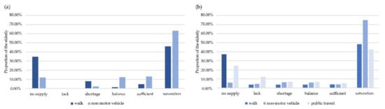 The proportion of elderly in two travel modes in Figure 4a appeared to be somewhat similar in that most of the elderly were in a state of “no supply” and “saturation”, whereas fewer older people were in a state of “balance”. For neighborhood parks, the proportion of the elderly with “no supply” was rapidly decreasing when the mode of travel changed from walking to non-motor vehicle, and the proportion of “balance” and “sufficient” increased accordingly. With the change of travel modes, the service area of neighborhood parks expanded to serve larger elderly population, which has reduced the park-to-population ratio of neighborhood parks. When the proportion of “shortage” and “no supply” decreases, the corresponding proportion of “lack” increases.